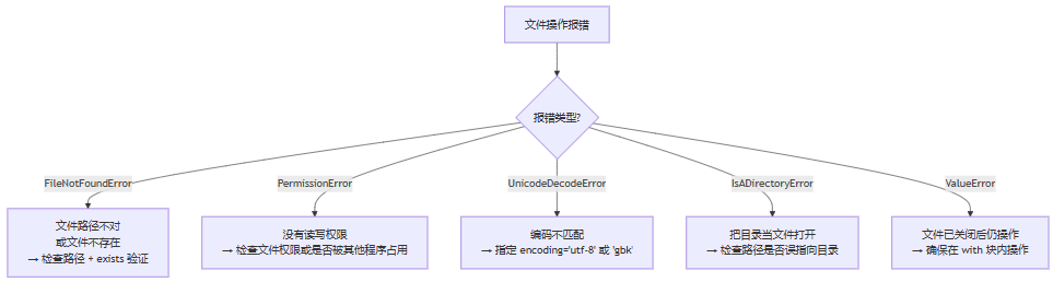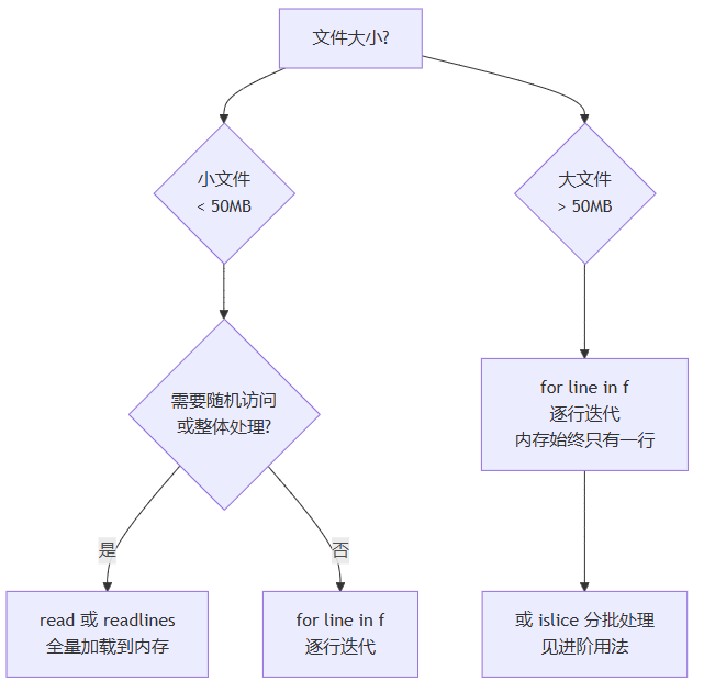 | 读取全部内容 | f.read() | 大文件慎用,内存全量加载 |