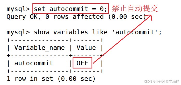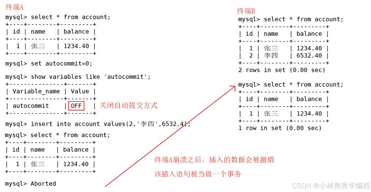 mysql> select * from account; +----+--------+---------+ | id | name | balance | +----+--------+---------+ | 1 | 张三 | 1234.40 | +----+--------+---------+ 1 row in set (0.00 sec) mysql> show variables like 'autocommit'; +---------------+-------+ | variable_name | value | +---------------+-------+ | autocommit | on | +---------------+-------+ 1 row in set (0.01 sec) mysql> set autocommit=0; query ok, 0 rows affected (0.00 sec) mysql> show variables like 'autocommit'; +---------------+-------+ | variable_name | value | +---------------+-------+ | autocommit | off | +---------------+-------+ 1 row in set (0.01 sec) mysql> begin; query ok, 0 rows affected (0.00 sec) mysql> insert into account values(2,'李四',6543.2); query ok, 1 row affected (0.00 sec) mysql> aborted