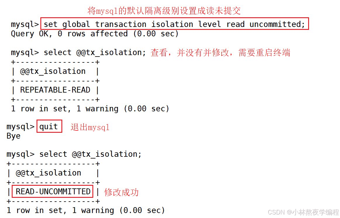 为了便于演示,我们将mysql的默认隔离级别设置成读未提交