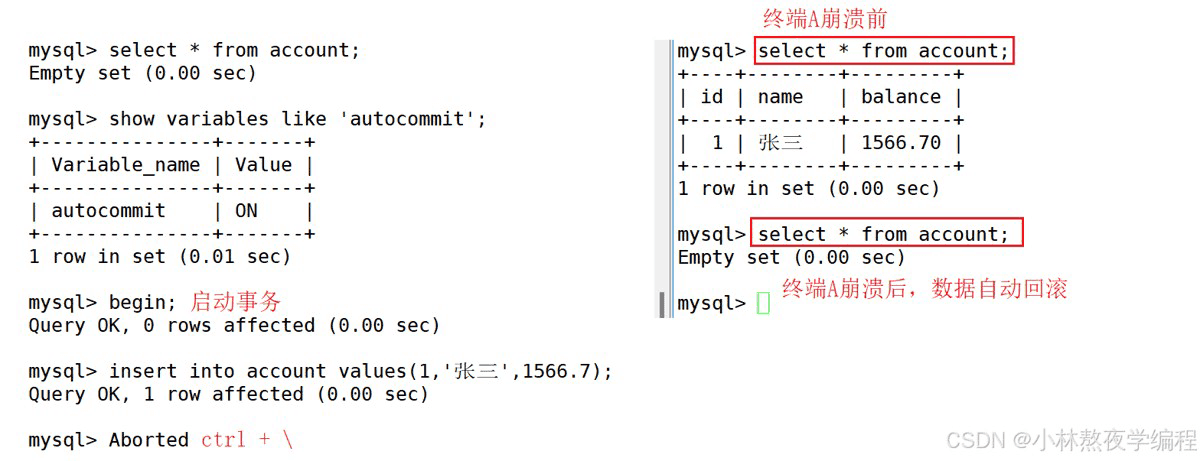 -- 终端a select * from account; -- 当前表内无数据 show variables like 'autocommit'; -- 依旧自动提交 begin; --开启事务 insert into account values(1,'张三',1566.7); -- 插入记录 -- 终端b select * from account; +----+--------+---------+ | id | name | balance | +----+--------+---------+ | 1 | 张三 | 1566.70 | +----+--------+---------+ 1 row in set (0.00 sec) -- 终端a mysql> aborted -- ctrl + \ 异常终止mysql -- 终端b select * from account; empty set (0.00 sec)