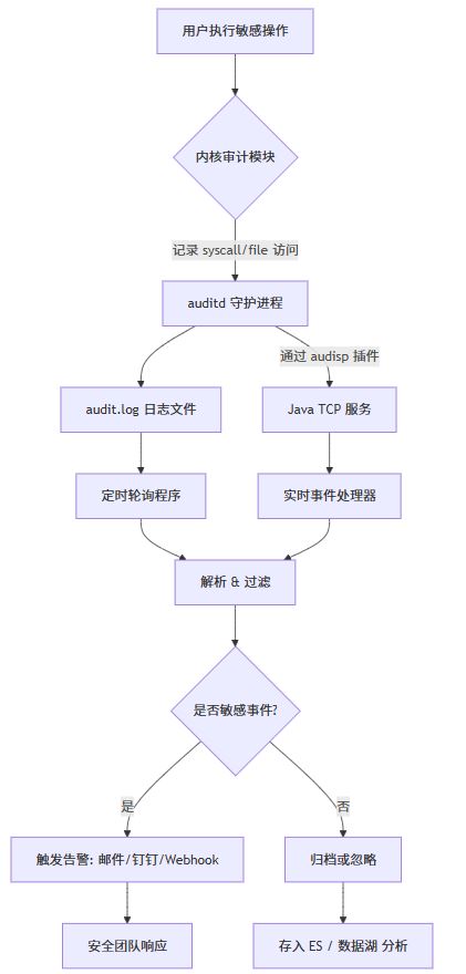 虽然 auditd 是系统级工具,但我们可以通过 java 程序监听或消费审计事件,实现安全告警、行为分析等功能。