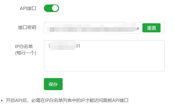 登录宝塔面板,找到设置/面板设置>api接口,点击api接口配置获取接口密钥,以及配置ip白名单.配置图如下