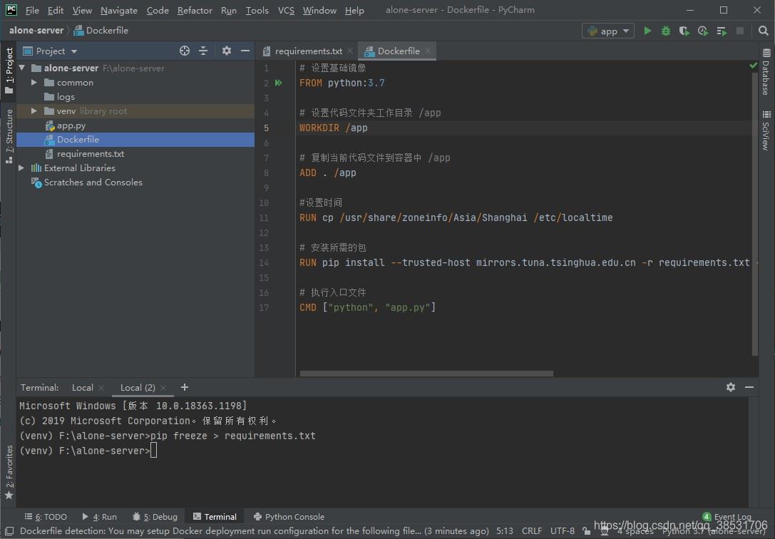 # 设置基础镜像 from python:3.7 # 设置代码文件夹工作目录 /app workdir /app # 复制当前代码文件到容器中 /app add . /app # 设置时间 run cp /usr/share/zoneinfo/asia/shanghai /etc/localtime # 安装所需的包,这里的requirements文件名需和项目生成的一致 run pip install --trusted-host mirrors.tuna.tsinghua.edu.cn -r requirements.txt -i https://mirrors.tuna.tsinghua.edu.cn/pypi/web/simple/ # 执行入口文件 cmd ["python", "app.py"]