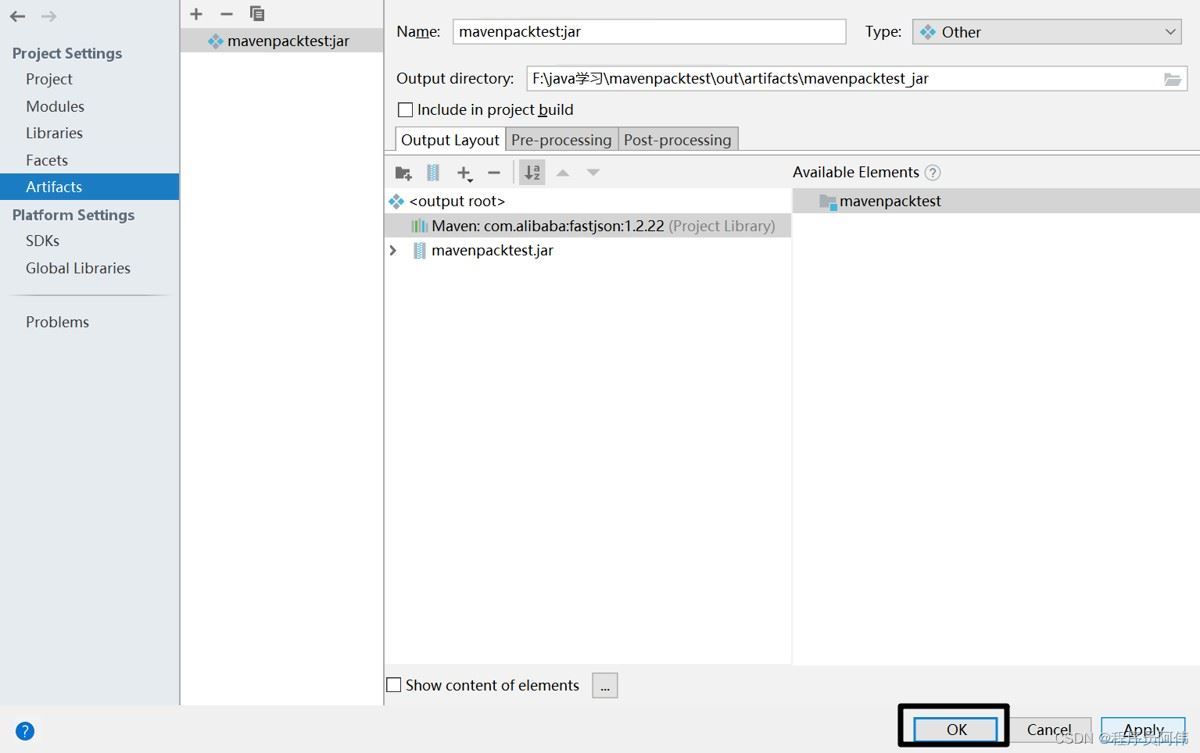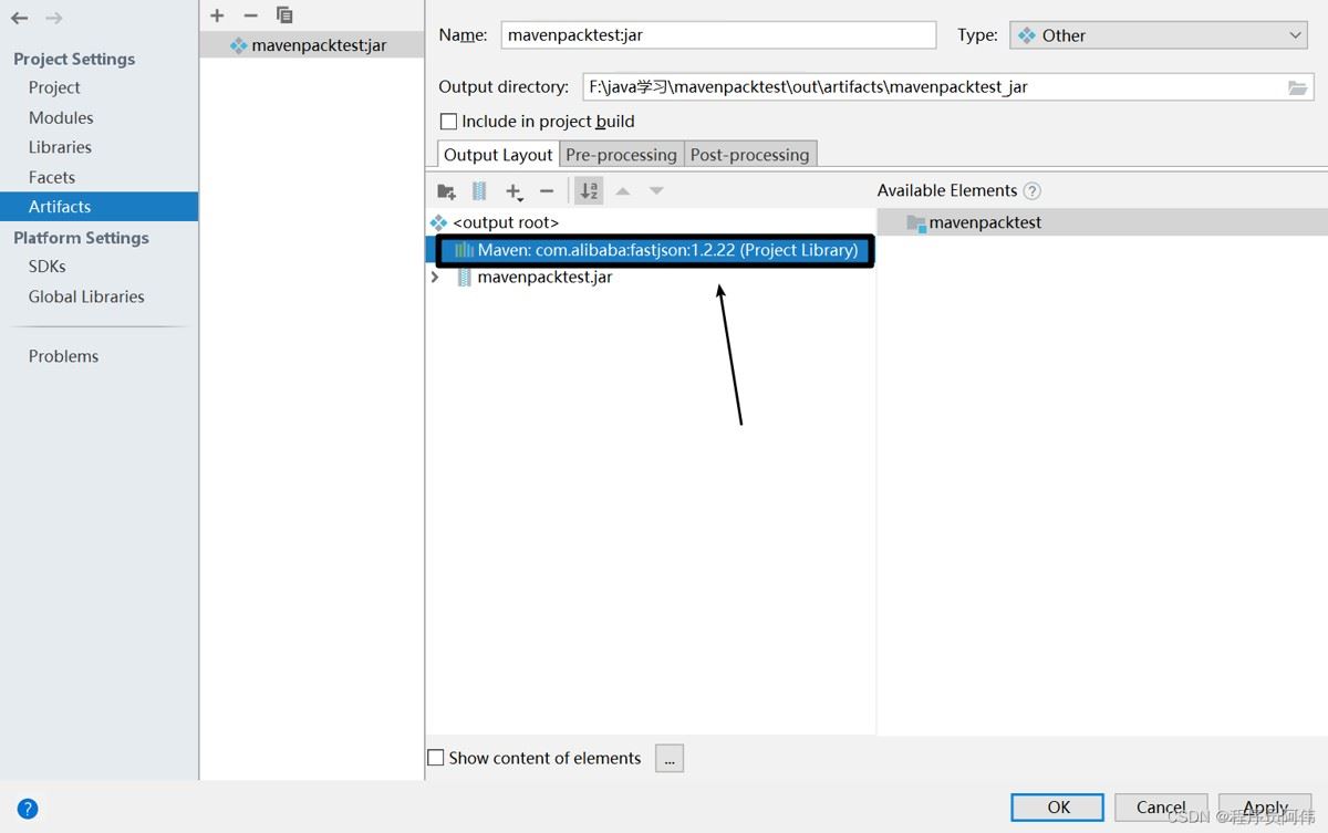 配置完后,我们可以看到引入的依赖也在被打包的范围,同时如果我们不想打包某个jar包进来,可以在此面板选择删除,这样就不会一同被打包了。