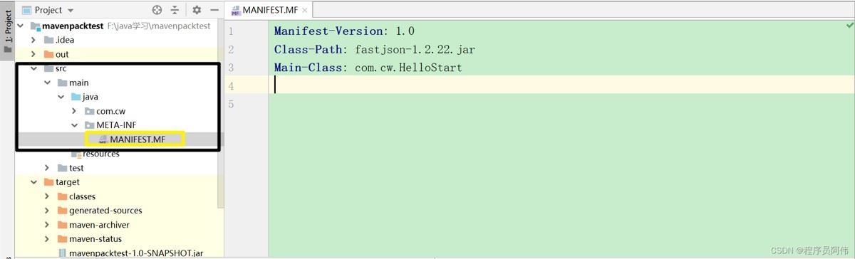 首先说maven-jar-plugin插件,它的思想就是:指定启动类、指定依赖包相对于项目最终 jar 包所在的路径、给manifest.mf文件添加class-path属性(运行项目 jar 包时会根据class-path属性来找到其他依赖 jar 包的路径),因此这个插件就是个配置manifest.mf文件的插件。