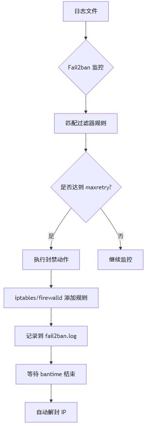 下面是一个简化的 fail2ban 处理流程图,帮助你直观理解其内部运作逻辑: