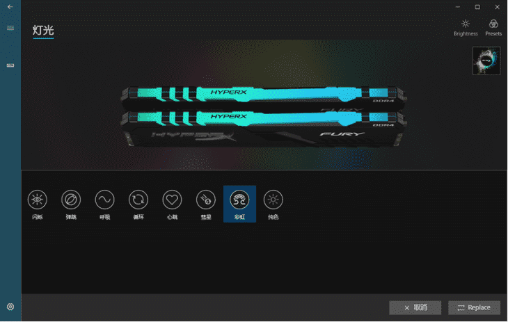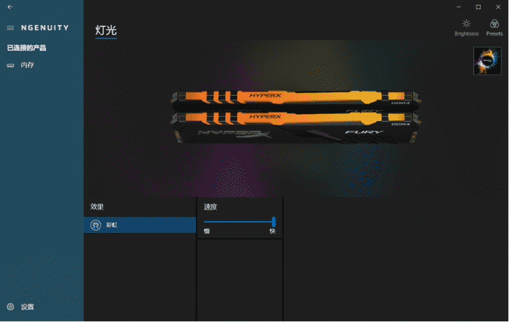 在hyperx ngenuity 2软件中,我们可以看到目前已经连接在pc上的支持灯效控制的hyperx硬件和外设,软件中支持对这些设备的灯光速度、强弱、效果进行调节。雷电流光系列骇客神条拥有“闪烁、弹跳、呼吸”等8种预置灯光效果,玩家还可以根据自己的喜好调节颜色。