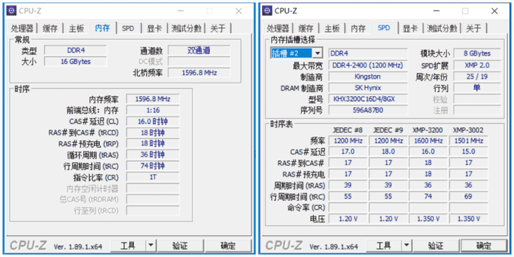 再次进入系统,cpu-z(版本1.89.1)已经能够正确识别出双通道16gb内存,内存频率3200mhz,时序cl16-18-18-36。同时还识别出这套内存采用的是来自sk海力士的颗粒,因此在稳定性上是非常有保障的,同时这套内存还支持xmp 2.0一键自动超频,小白用户也能获得免费的性能提升。
