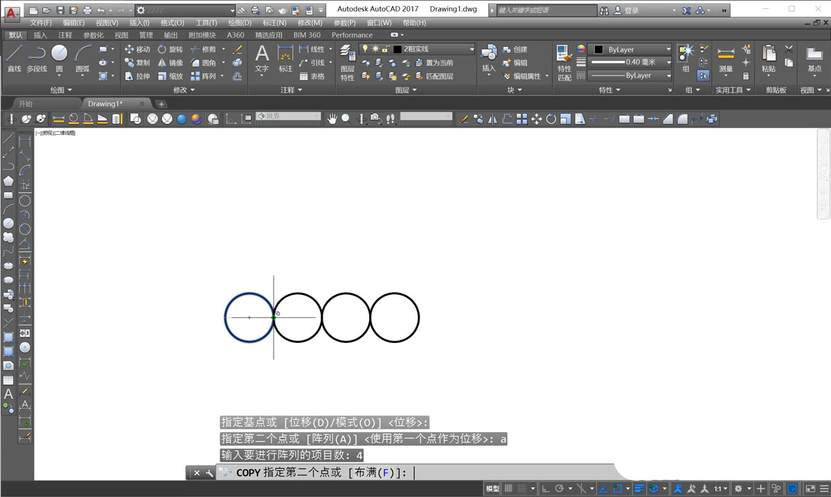 首先,绘制一个圆形,这里让他的半径为10,然后使用copy命令复制圆形,并输入字母a,输入阵列数目为4.