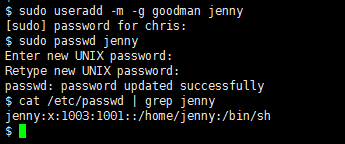 5、chris这个用户没有附加组sudo的权限,创建不了用户。