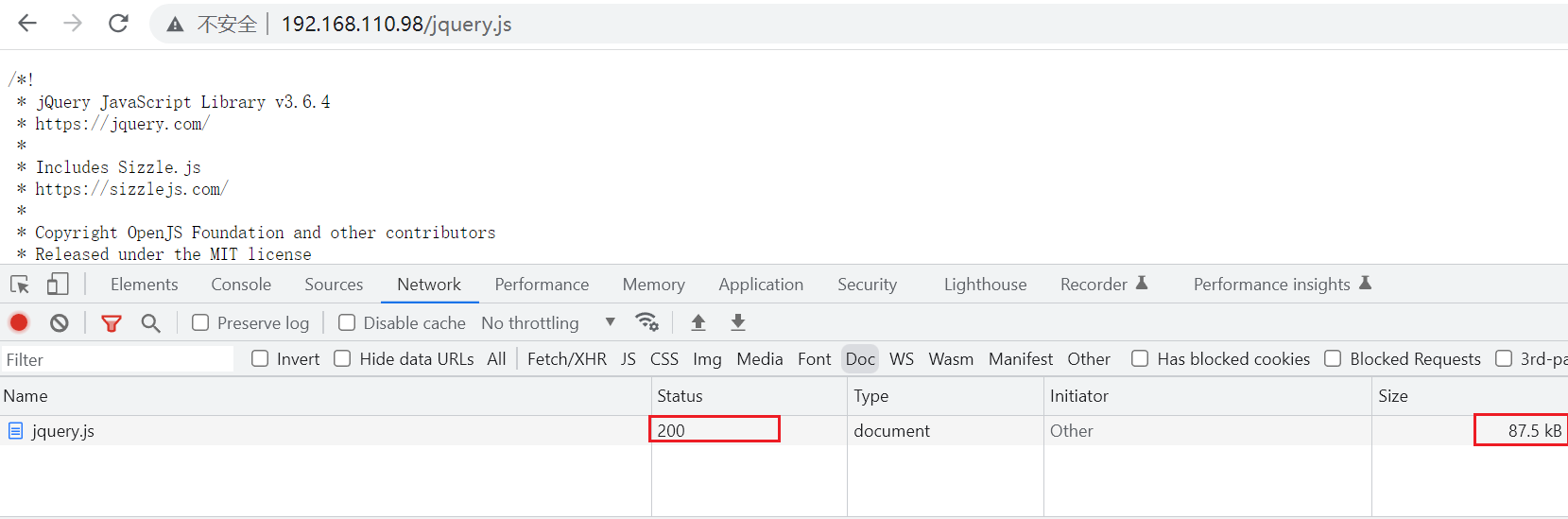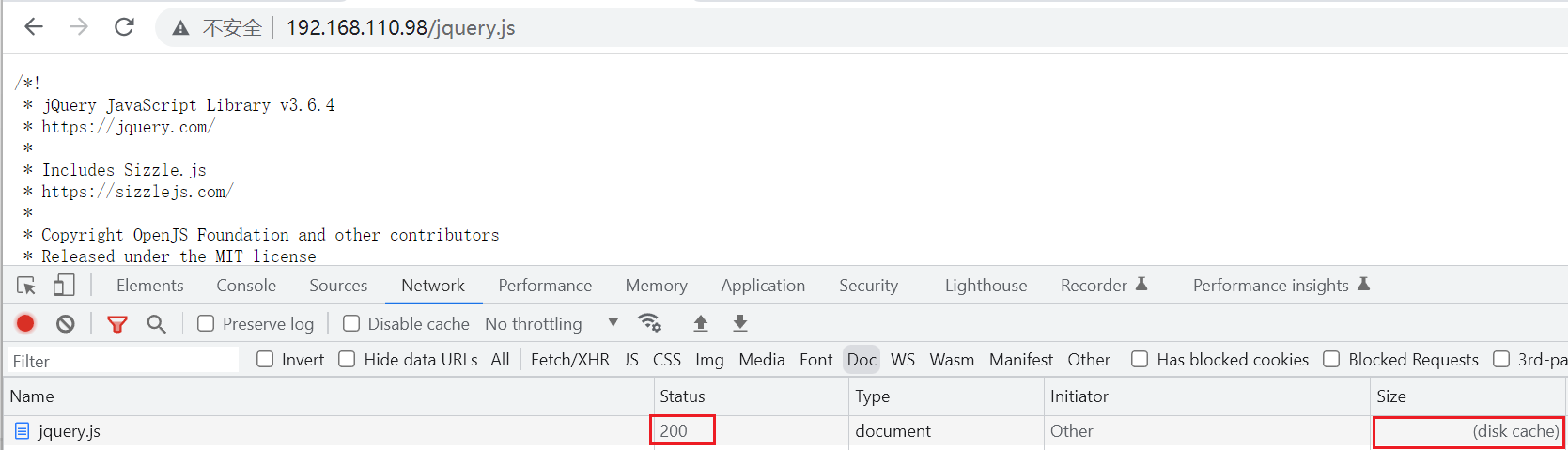 了解流程之后,我们来具体演示一下。访问页面:http://192.168.110.98/jquery.js