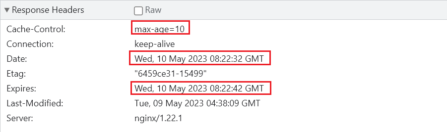 发送请求,查看结果,和预期保持一致。date和expires的时间也是相差10s。