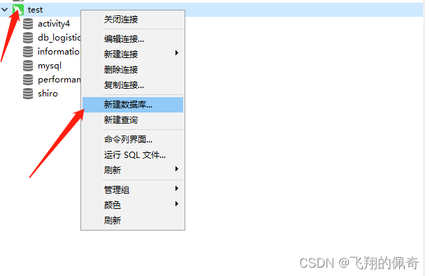 2、右击test 选择 新建数据库