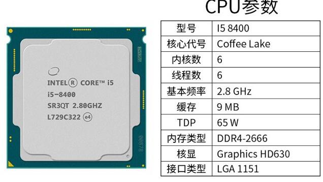 i5-8400是intel今年上市的八代酷睿处理器,14nm制程,6核6线程设计,默认2.8ghz主频,加速频率达到3.8ghz,9mb三级缓存,内置uhd630核心显卡,支持ddr4-2666双通道,热功耗设计为65w,最佳搭配b360主板使用。