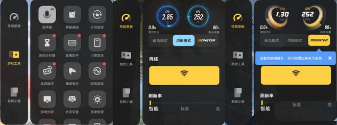 还要提到的是iqoo pad的originos 3hd系统中有一个游戏助手,它是游戏玩家不可或缺的小工具,其会随游戏启动,自动屏蔽信息干扰,还能提供非常多的快捷设置。另外可以在性能面板里直接切换工作模式,选中monster就是拉满性能的操作。