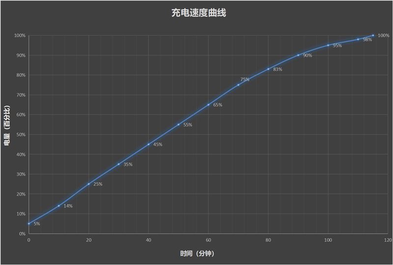 我们首先将vivo pad2的电量消耗至5%,进行灭屏充电,半小时充电至35%,1小时充电至65%,90分钟充电至90%,最终完全充满用时115分钟,如果从0%开始充电,最长大约需要125分钟左右,远远超过了官方宣传的139分钟。