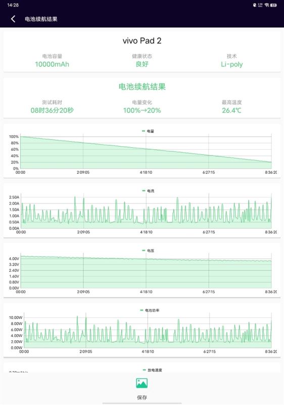 在测试之前,我们将vivo pad2的刷新率调为自适应,将亮度调至50%并关闭自动亮度,在电池狗狗的测试下,电量从100%消耗至20%,用时8小时36分钟。