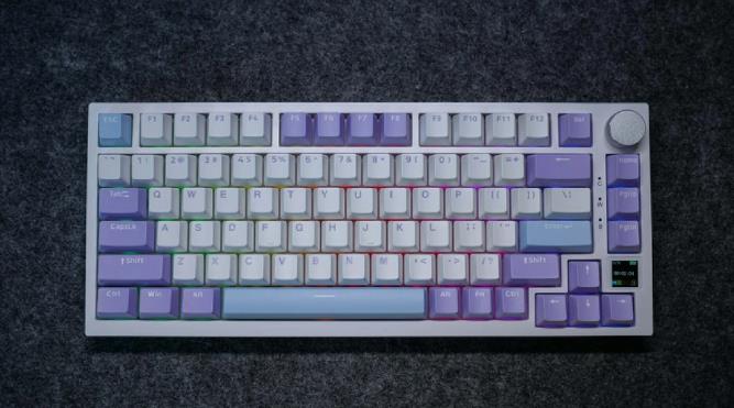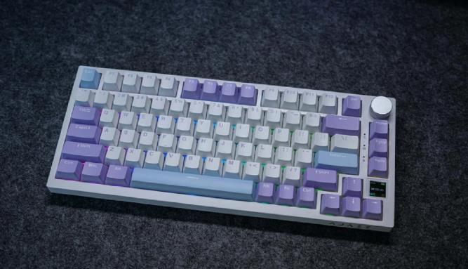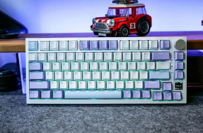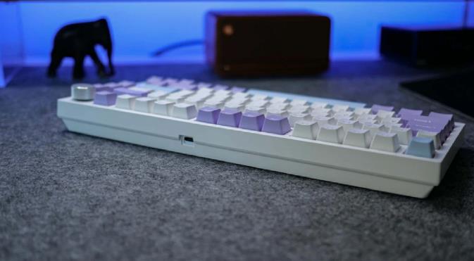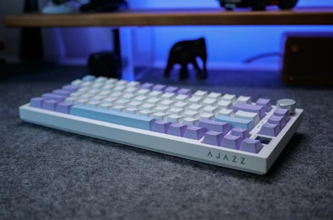 简单过一下外观吧, 黑爵ak820 pro键盘外观采用硬朗方正的设计,棱角分明,看起来非常的简洁。pro版一共有青梅嗅/雾川海/星晚灰三个配色,我收到的这把是雾川海配色,白色键盘主体搭配蓝白紫三拼色键帽,在配色上还是很清爽的。