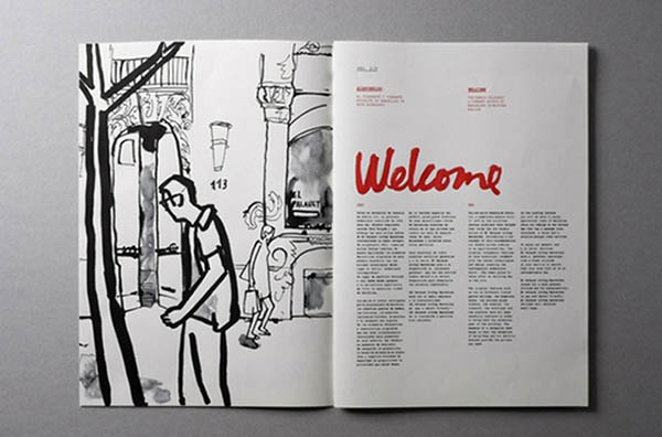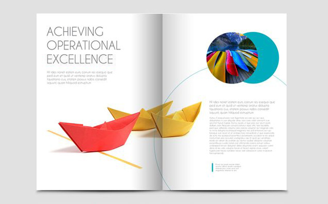 下面的画册设计中,除了左边的第三行文字用了红色,其他的文字都是灰色,视觉上形成了差异化,当然这个红色就是来源于图中纸船里的红色。