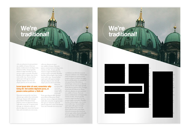 文字与图片是平面设计的两大最主要元素,所以掌握图文对比手法也是必不可少的。图片与文字的组合方式有很多种,如:并列排版、文字绕排、图叠文、文叠图等等,图片出现的形式主要分规则的几何形和不规则的异形两种,这些我们都可以根据实际需要进行选择。