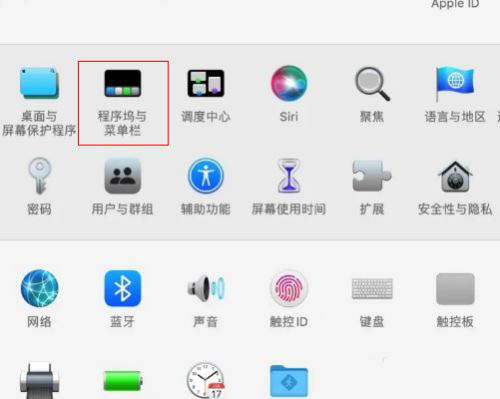 2、进入系统偏好设置界面,点击程序坞与菜单栏进入。