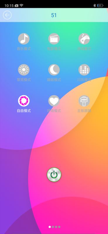 通过点击连接好的对象即可鑫谷这款机箱内的灯光进行统一调节,值得注意的事,用户需要在调节之前点击图上的开关按钮,否则连接成功也将无法进行操控。该界面共有常亮、睡眠、闪烁、自由、呼吸、跟随主板以及特有的音乐、电影、游戏模式,用户可在每种模式下通过右滑的方式调节灯光的具体参数,包括颜色、频率等。