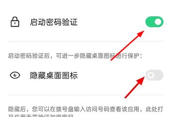 5、最后点击启动密码验证和隐藏桌面图标后面的按钮打开就可以了。
