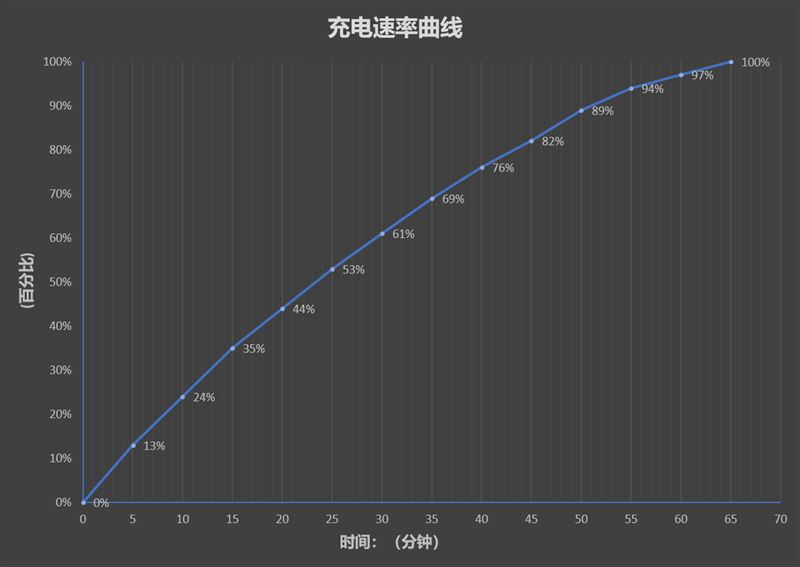 实测10分钟充电24%,30分钟时充到了61%,充满100%共耗时65分钟。
