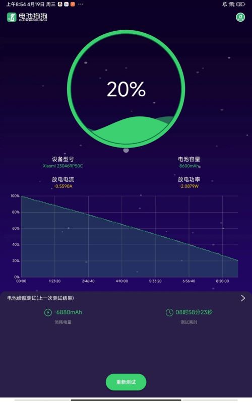 实测从100%电量到20%电量的时间为8小时58分,以此计算,满电状态下可以坚持11小时20分钟。
