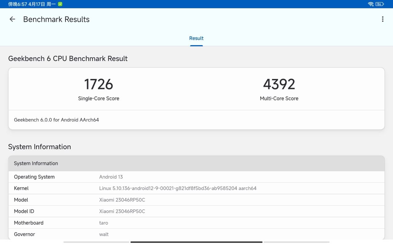 鉴于骁龙 8+ 已经是一枚被广泛使用的芯片,理论性能方面我们这次就简单看看 geekbench6 的跑分,xiaomi pad 6 pro 的单核分数达到了 1726 分,多核分数 4392 分,这个成绩相比其它配置相近的骁龙 8+ 手机明显更高,相比天玑 9000 芯片更有优势,相比最新旗舰芯片骁龙 8 gen2 的单核也仅仅相差 200 分左右,可以说还是很能打的。