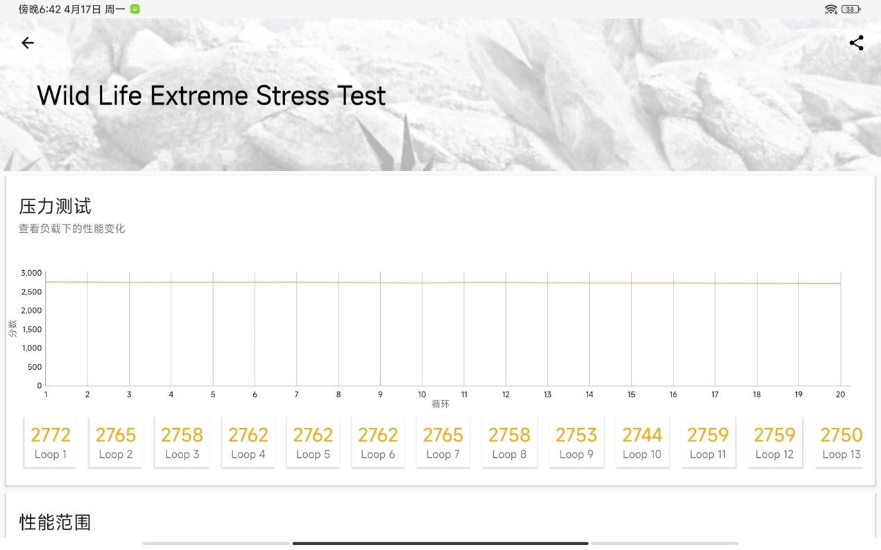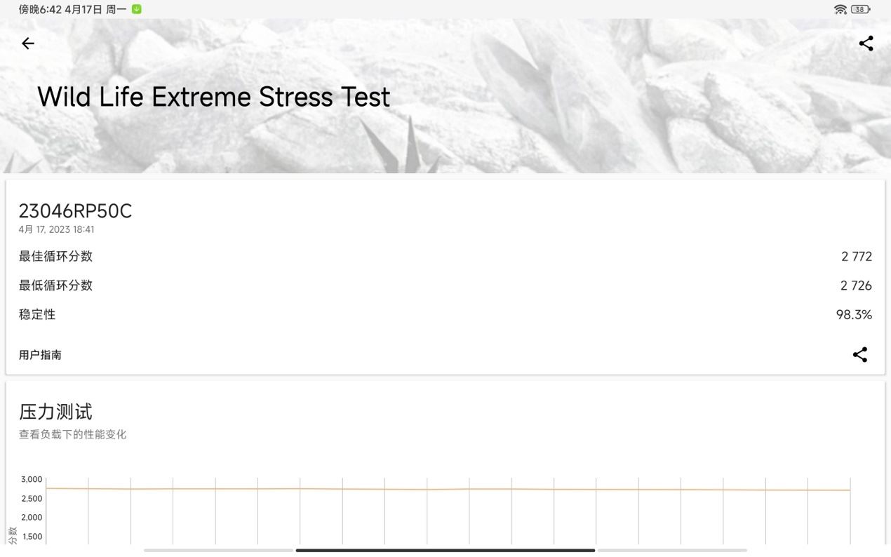 然后我们再通过 3d mark 的 wild life extreme stress test 压力测试来看看 xiaomi pad 6 pro 的持续性能输出稳定性如何,经过 20 轮压力测试后,xiaomi pad 6 pro 的表现非常稳定,分数曲线拉成一条直线,稳定性高达 98.3%,这个成绩在平板产品中也尤为突出,相比天玑芯片的机器优势明显。