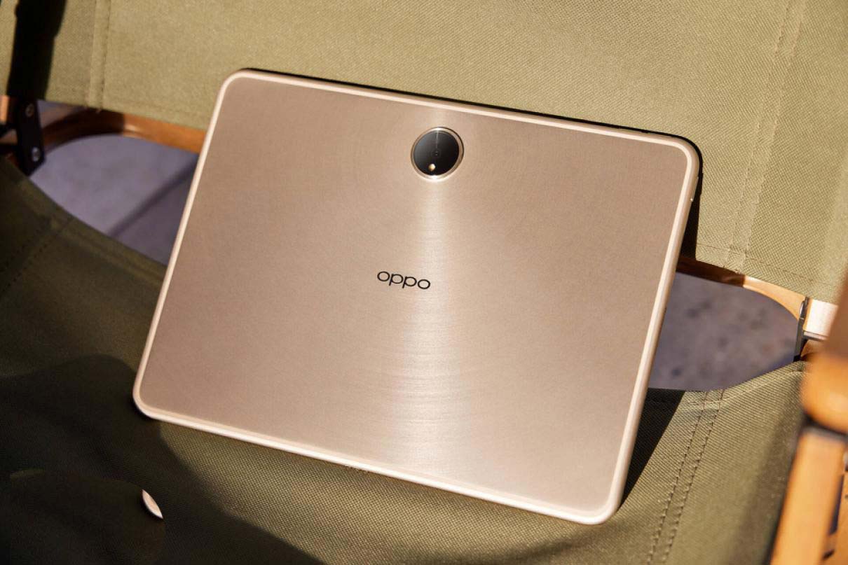 在摄像头上,这一次 oppo pad 2 采用了居中设计,细腻的“星轨”纹理从这颗摄像头上扩散而来,一直到机身最边缘位置。