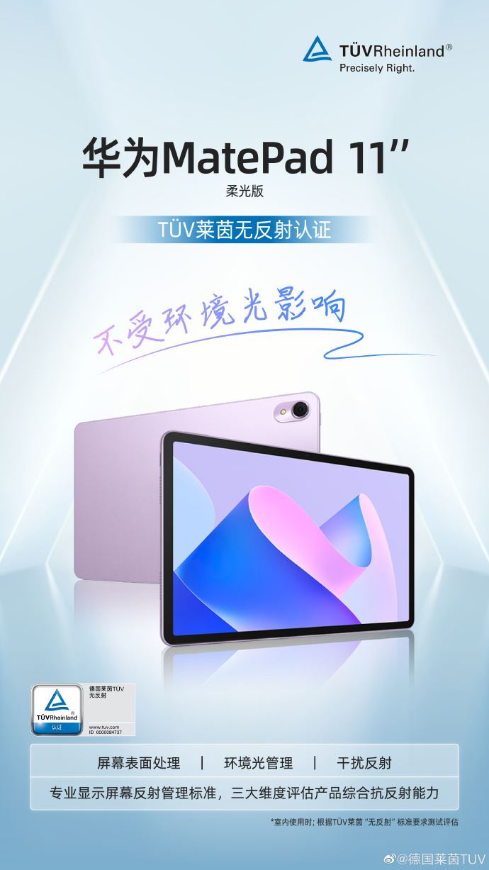 华为 matepad 11 英寸 2023 款柔光版平板电脑通过 tuv 莱茵无反射认证。tuv 莱茵无反射标准定义了显示产品的环境光条件,从屏幕表面处理、环境光管理、干扰反射三个维度定义显示产品的综合抗反射能力。符合该标准的产品能够让消费者在室内使用时不受环境光的影响,有效提升使用体验。