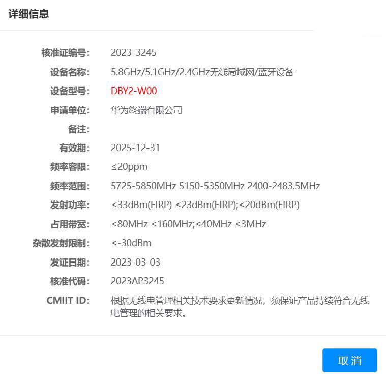 华为终端有限公司此前一款型号为 dby2-w00 的设备通过工信部无线电核准,预计为华为 matepad 11 2023 款,支持双频 wifi。我们附上相关认证: