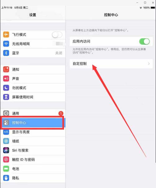 3、在控制中心中找到“自定控制”,进行点击。
