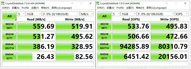 crystaldiskmark 7.0.0版测试中,顺序读取速度为559.69mb/s,写入速度5119.91mb/s,与sansung magician的检测结果基本一致。我们在日常工作中,比如运行程序、游戏等操作,更多地是随机读取,4k q32随机读取速度达到94k iops,写入为80k iops。这样的读写次数,足以应对日常高负荷下的数据传输。