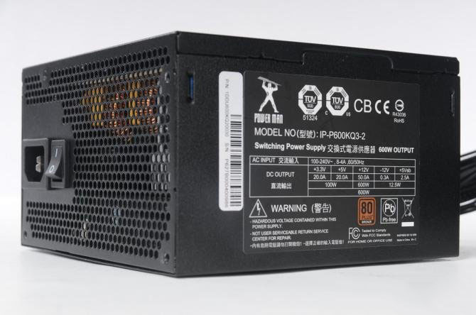 标配的电源,型号ip-p600kq3-2,为600w铜牌认证非模组电源,在型外尺寸上,与标准atx电源相符,长度测量为140mm,如果要更换电源切记长度勿超过140mm,在电源接头部份,提供24pin*1、4+4pin*1、6+2pin(含一分二接线)*1、sata*3、sata(含转接micro usb,供无线充电模块使用)*1。