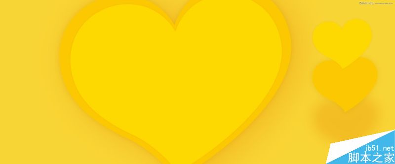 按照草图我铺了个底色,并且画上了爱心。选用饱和度不是很高的黄色。爱心就用形状工具画的,然后发现太正规了,不太适合构图,就用钢笔工具稍微改了一点点,让它倾斜一点,并且叠加了三层,更有层次感。看右边的分层展示,都加有阴影。
