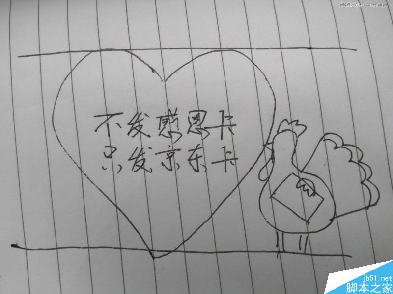 我把想法画在了纸上,便于我寻找素材和做图,以免忘记,顺便也可以看看哪里不对。当时想既然送卡,又是感恩节,于是就直接把我念念不忘的火鸡(这明明是一只鸡!)放上来送卡了,适合主题也很形象。