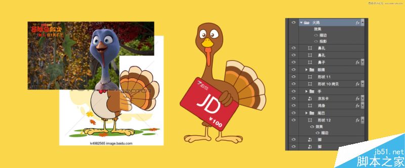 这个素材并没有现成的,而且我怕官网放别人的火鸡会有版权问题,所以爱照自己构思中的拿着京东卡的火鸡,用钢笔结合形状勾了一只鸡,对,就是一只合成鸡。我找了火鸡总动员的女主珍妮,还有几个卡通的火鸡作为参考。当然也有好多细节扔掉了,嘴巴,肚皮等等,因为太复杂了,我偷懒了-。-