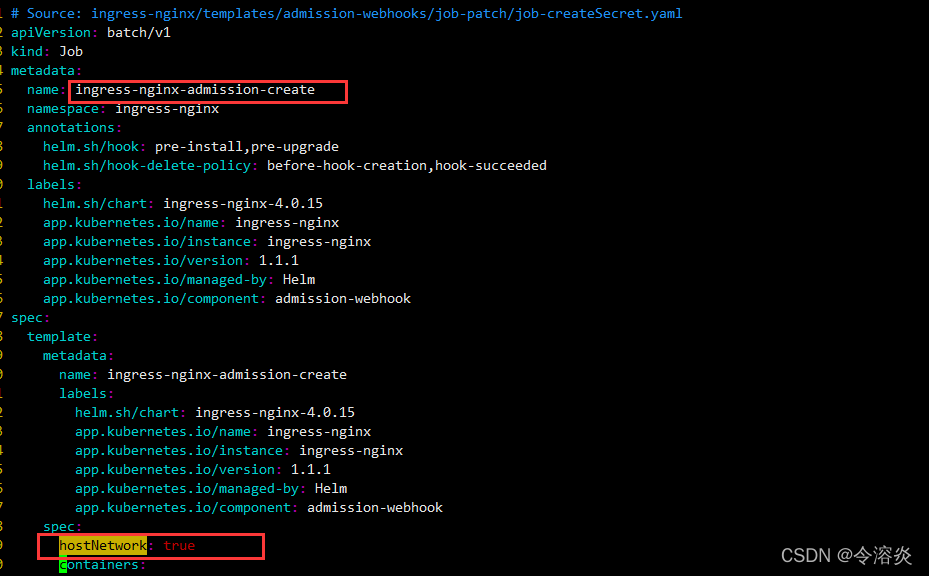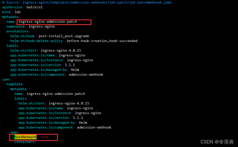 在deploy.yaml中ingress-nginx-admission-create和ingress-nginx-admission-patch的job资源下的spec.template.spec中添加如下hostnetwork: true,重新部署