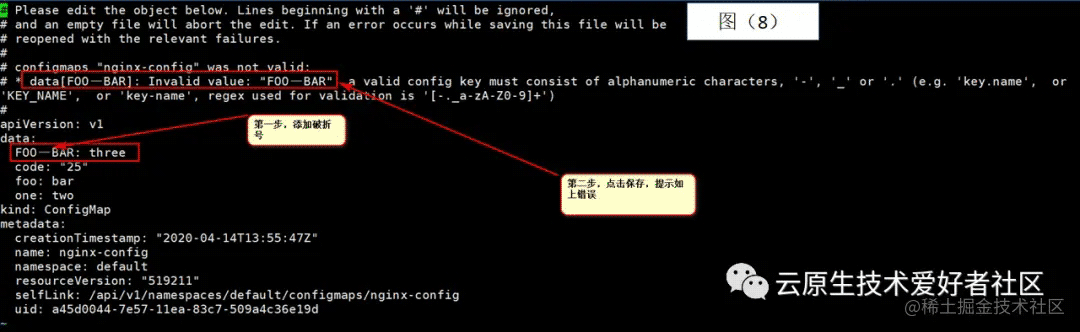 其大概意思是,配置键中不能包含破折号,如果包含则不能设置到环境变量中,此书这部分是基于 kubernetes 1.6 进行编撰,而我使用的是 kubernetes 1.14,不清楚是不是因为 kubernetes 已经改进的原因,还是其他原因,我有两点不解的地方。
