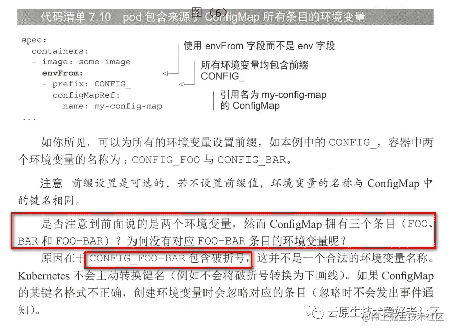 以上解释了通过在 yaml 设置 env 引用 configmap 中配置作为环境变量的使用,在使用过程中,我参考了 《kubernetes in action》这本书,发现此书中有一段是这样描述的,如图(6)所示: