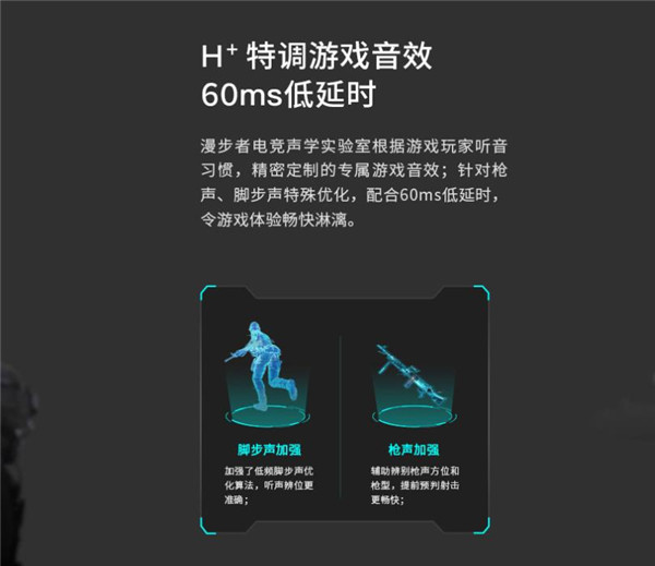 漫步者电竞gx07在游戏方面的体验真不是盖的!其根据游戏玩家的听觉习惯,特意定制了专属的游戏音效,即h+特调游戏音效。在该音效的加持下,有效对脚步声、枪声进一步加强,相信对于平时喜欢玩吃鸡类手游的玩家们来说,绝对是一个福音啊!