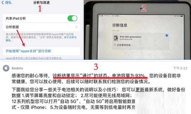 诊断结束后,客服告知设备的剩余电池寿命,这一次的结果是93%,比爱思助手的数据要高了2%。虽然过程麻烦了些,但是apple 支持提供的数据是最准确的,而且不需要身边有电脑。