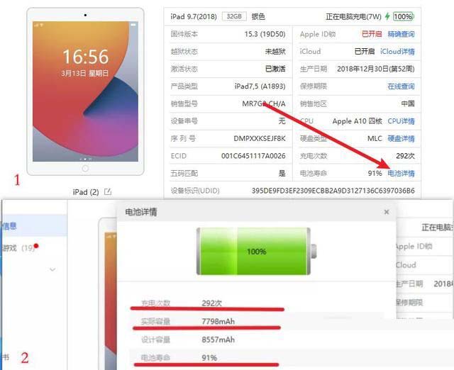 接下来会提示你安装itunes驱动,然后我们在ipad上,点击确认信任该电脑,就可以在电脑上看到ipad的设备状态。点击右下角的“电池详情”,就可以查询到详细的电池寿命、实际容量、生产厂商等。