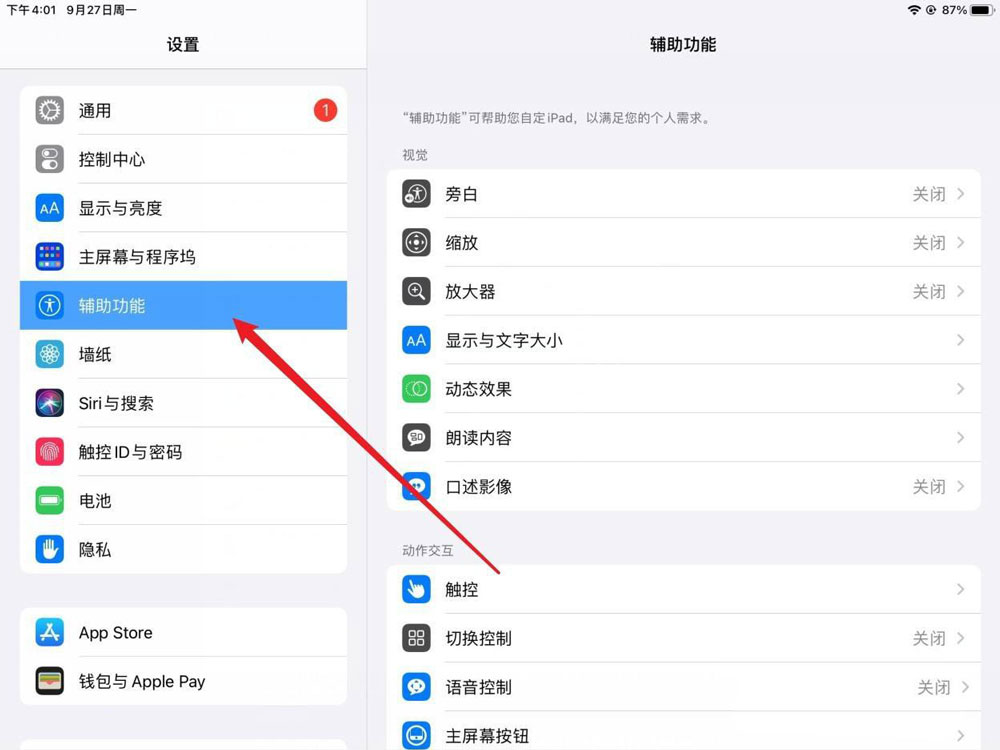点击辅助功能。进入设置页面,在左侧选择辅助功能。
