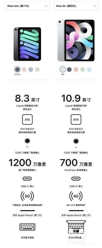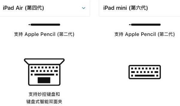 两款同样支持二代的apple pencil,但键盘上,ipad air 4支持妙控键盘和键盘式智能双面夹,而ipad mini 6支持蓝牙键盘。在灵活度上面,ipad air 4会更加高点,妙控键盘和键盘式智能双面夹的兼容性和适配性会比蓝牙连接的键盘更加稳定。不过妙控键盘略重噢。