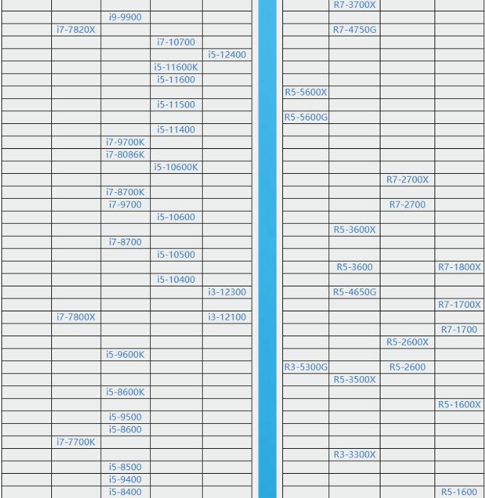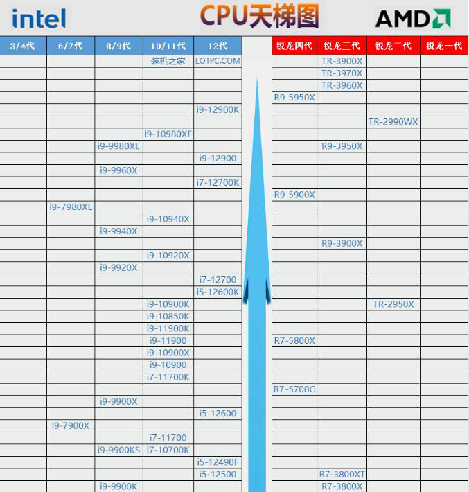 装机之家cpu天梯图精简版主要是近几代产品,intel cpu包括了四代、六代、七代、八代、九代、十代、十一代cpu以及刚推出的十二代cpu,目前装机建议的是部分十代、十一代和十二代cpu,而amd cpu主要是锐龙一代、二代、三代以及全新的四代5000系列,目前在售主要是三代3000系列和四代5000系列锐龙,现阶段装机建议5000系列四代锐龙产品。