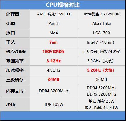 锐龙9-5950x和酷睿i9-12900k区别对比: